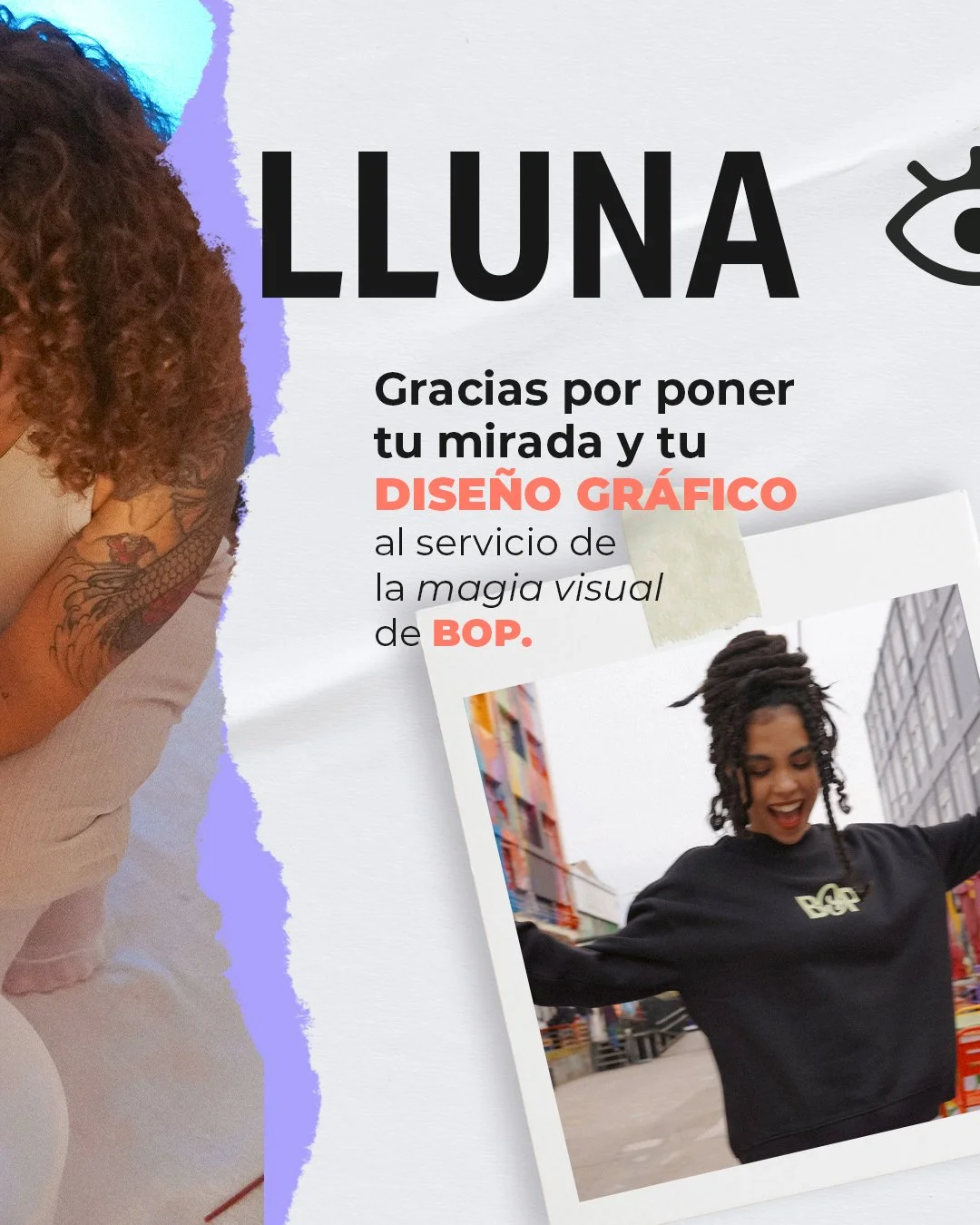 Lluna, diseñadora gráfica, es la mente y el corazón detrás de toda la identidad visual de BOP. Su mirada creativa, su sensibilidad y su forma de entender el diseño han hecho que el proyecto respire lo que somos: frescura, conexión y cuidado.